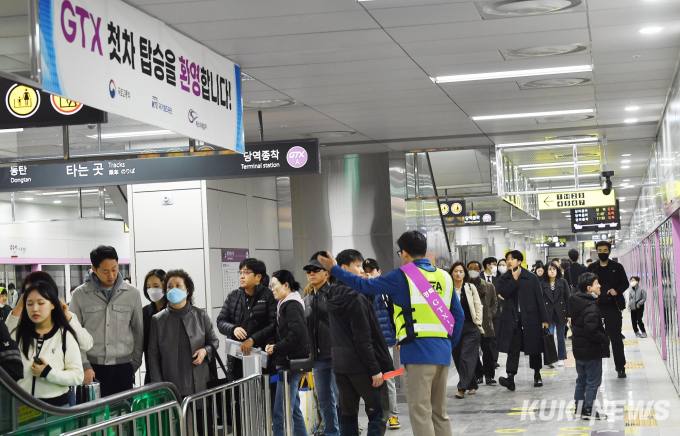 ' GTX 타러가요'박상우 국토교통부 장관은 GTX의 첫 운행과 수서역의 승강장을 살펴본 의미에 대해 묻는 질문에 “GTX의 개통으로 지역과 지역을 고속으로 이동함으로써 새로운 비즈니스 기회가 만들어 질 수 있고, 도시 활성화에 경쟁력이 생길 수 있을 것으로 기대한다”고 말했다.