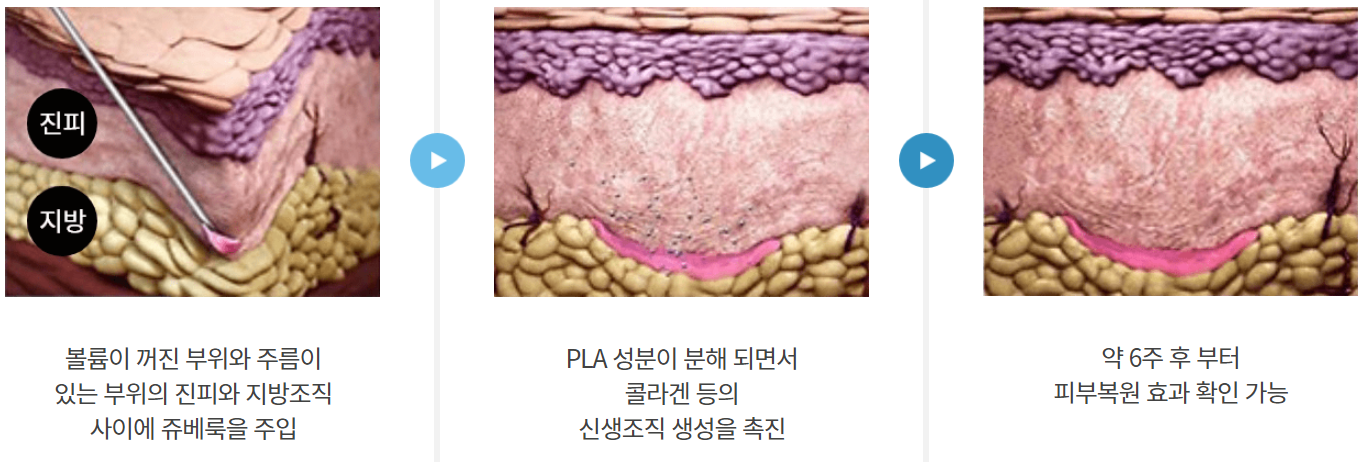 쥬베룩은 콜라겐 형성 유도 물질인 PDLA와 히알루론산 성분을 결합시킨 콜라겐부스터를 말합니다. PDLA로 인해 콜라겐이 형성되는 효과와 히알루론산에 의해 물광 효과를 동시에 느낄 수 있는 점이 쥬베룩의 가장 큰 장점입니다.